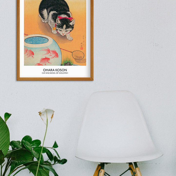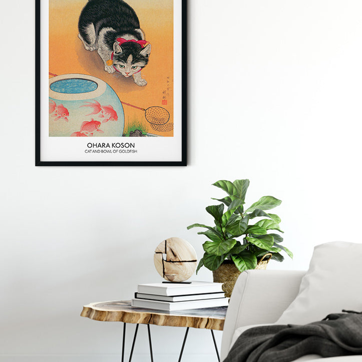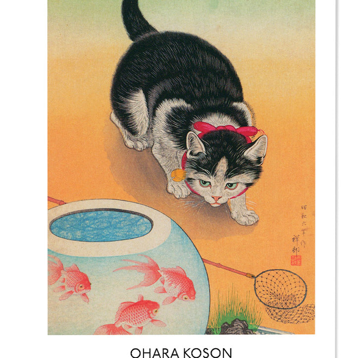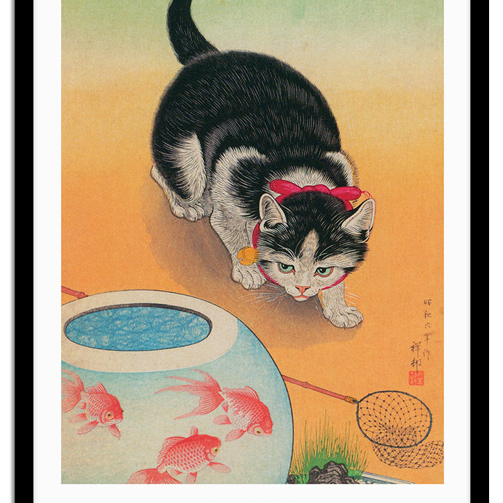 Cat with a Bowl of Goldfish, art poster by Ohara Koson. Vintage cat and goldfish illustration.