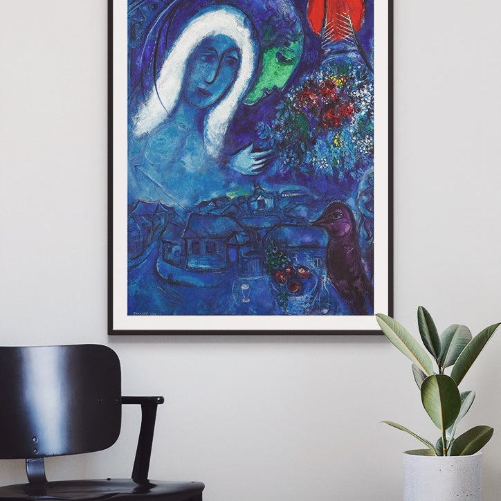 Marc Chagall created Field of Mars (Camps de mars) in 1955 in Surrealism style. This is a reproduction of a vintage French art poster. The print will be delivered without the frame.
