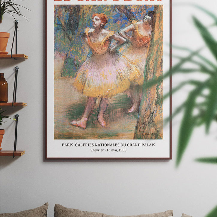 Edgar Degas (1834-1917) exhibition poster featuring his painting Two Dancers. Degas was a French Impressionist artist famous for his pastel drawings and oil paintings but he also produced bronze sculptures, prints and drawings. He is especially identified with the subject of dance as more than half of his works depict dancers.