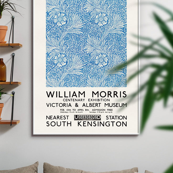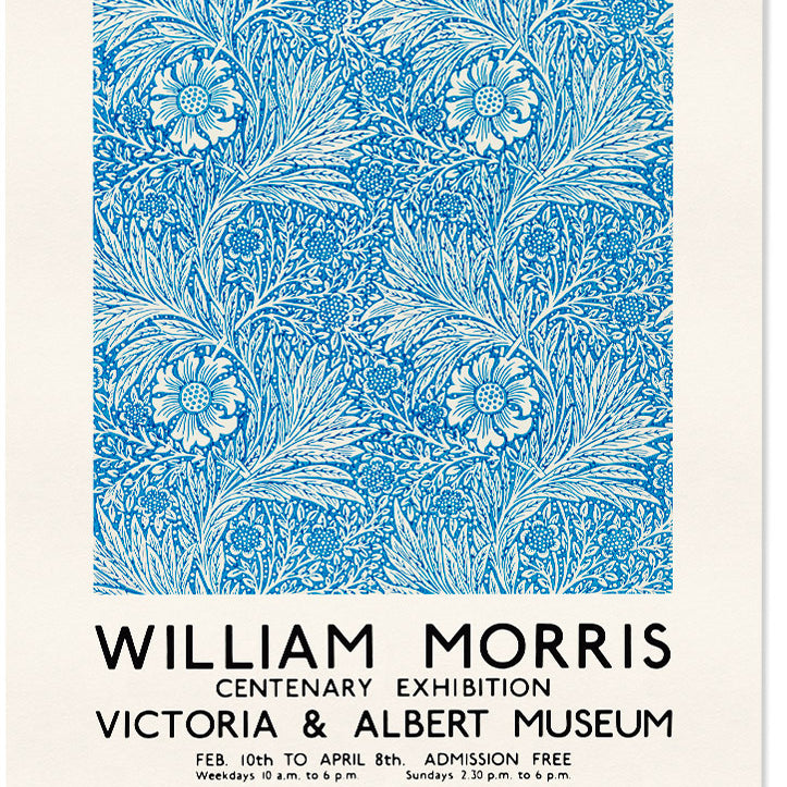 'Blue Marigold' floral illustration. Reproduction of a William Morris exhibition poster for the Victoria and Albert Museum in London.