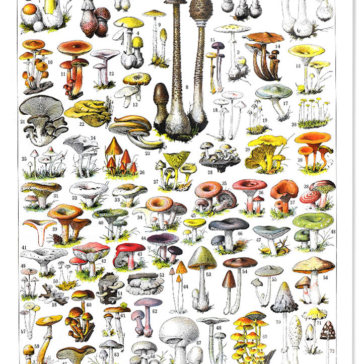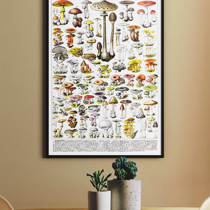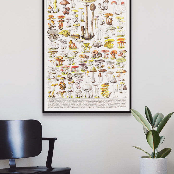 This beautiful vintage poster by Adolphe Millot showcases the mushrooms of the countryside. The vibrant colours and intricate details make this poster a perfect addition to any kitchen or living room.