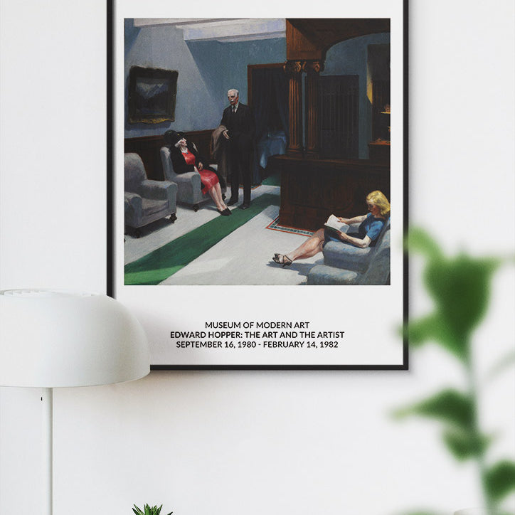 Edward Hopper art poster featuring his painting the Hotel Lobby. Hotel Lobby is a 1943 oil painting on canvas by American realist painter Edward Hopper; it is held in the collection of the Indianapolis Museum of Art