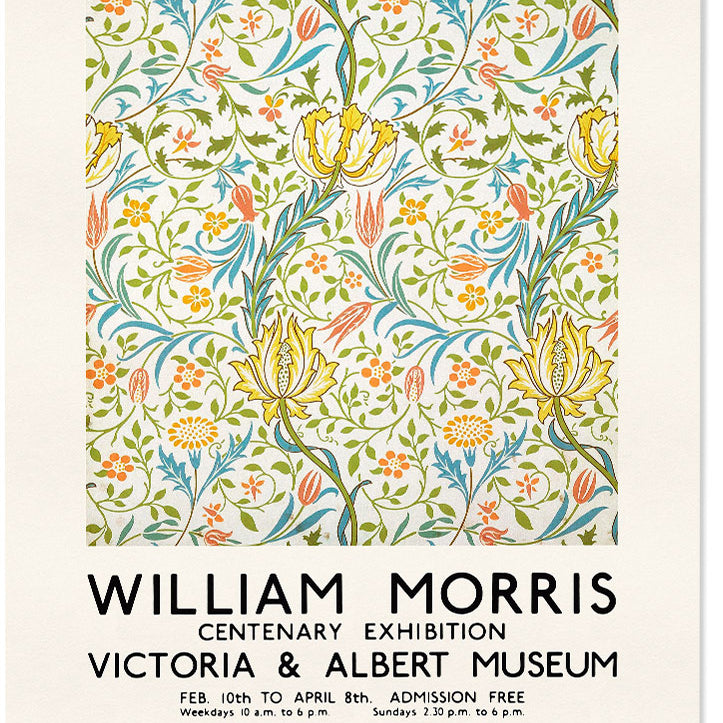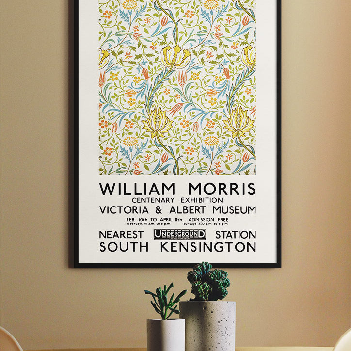 Floral print by the famous artist William Morris in green, yellow and blue colours. A William Morris print will never go out of style and is a great choice of art to decorate your space.
