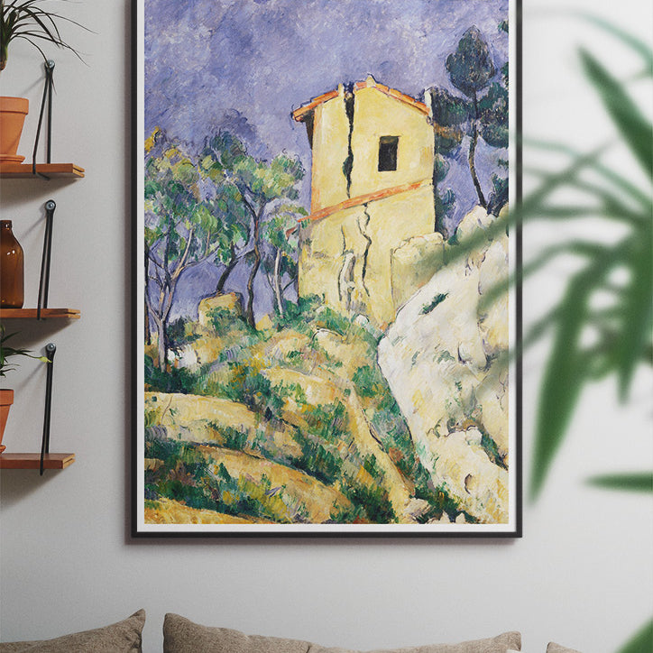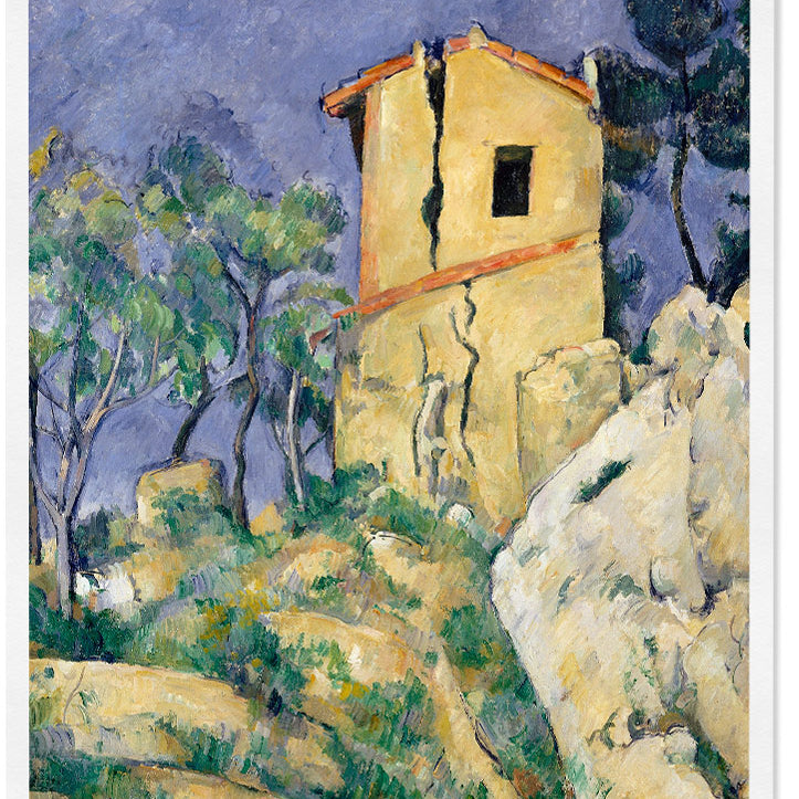 Paul Cézanne poster featuring his artwork The House with the Cracked Walls. Cézanne is one of the great Post-Impressionist painters of the 19th century, renowned for his landscapes, portraits, and complex still lifes.