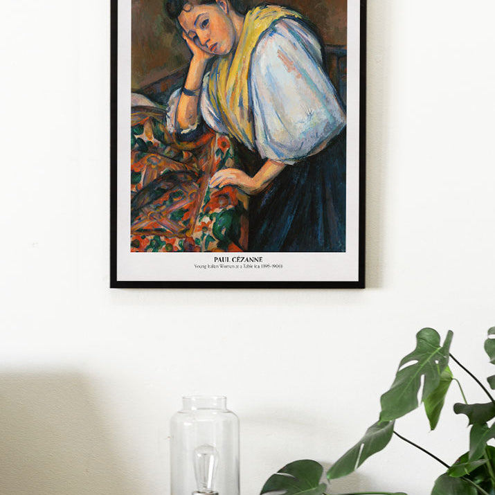 Paul Cézanne poster featuring his artwork Young Italian Woman at a Table. Cézanne is one of the great Post-Impressionist painters of the 19th century, renowned for his landscapes, portraits, and complex still lifes.
