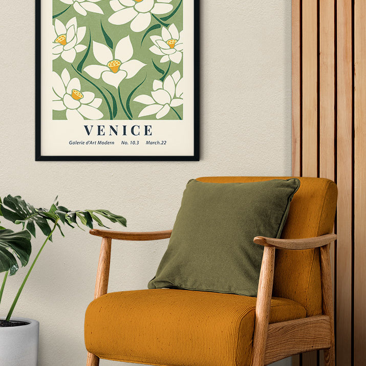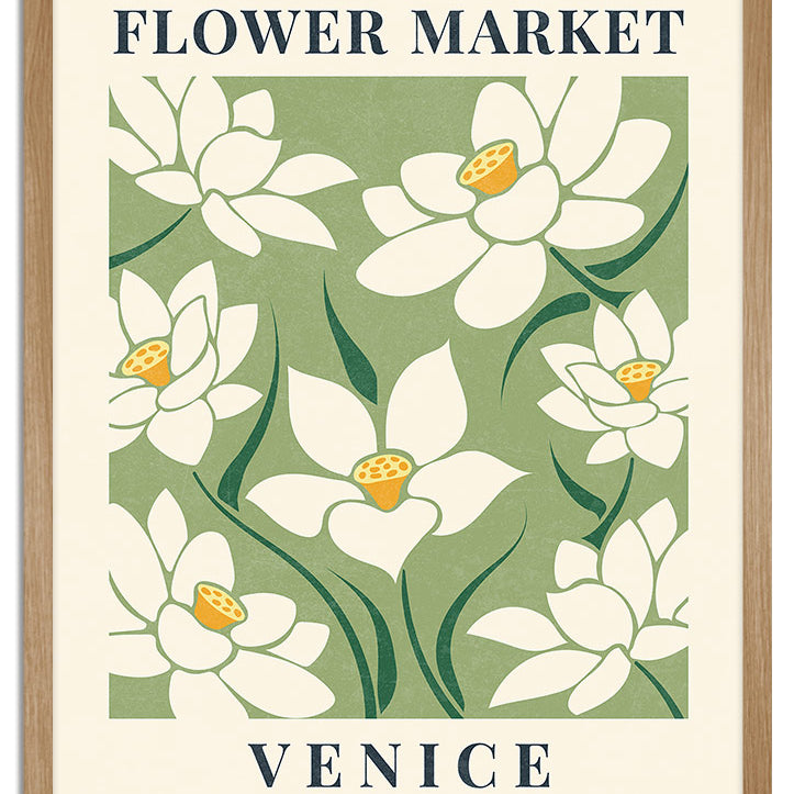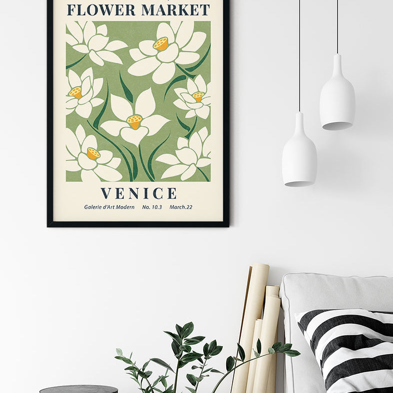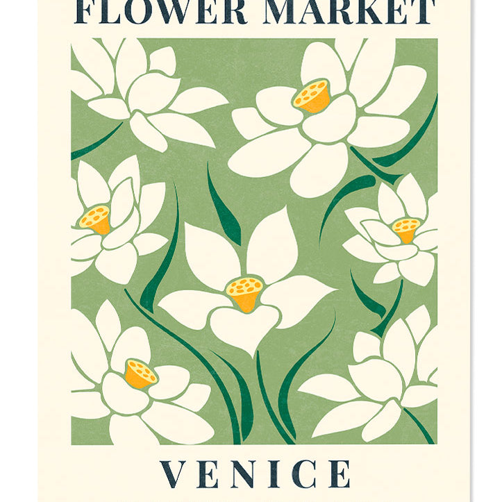 This Venice Flower Market Poster is a beautiful wall art to brighten your home. Green, white and yellow colours, with text at the top and bottom. Printed on to 200gsm matte paper. See the full Flower Market Collection here >